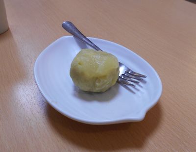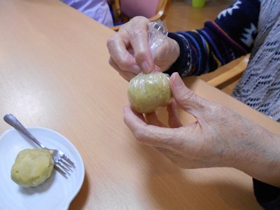 10月17日、今日のおやつは手作り「九里(栗)4里(より)うまい十三里(サツマイモ)」とりんごの巾着絞り。