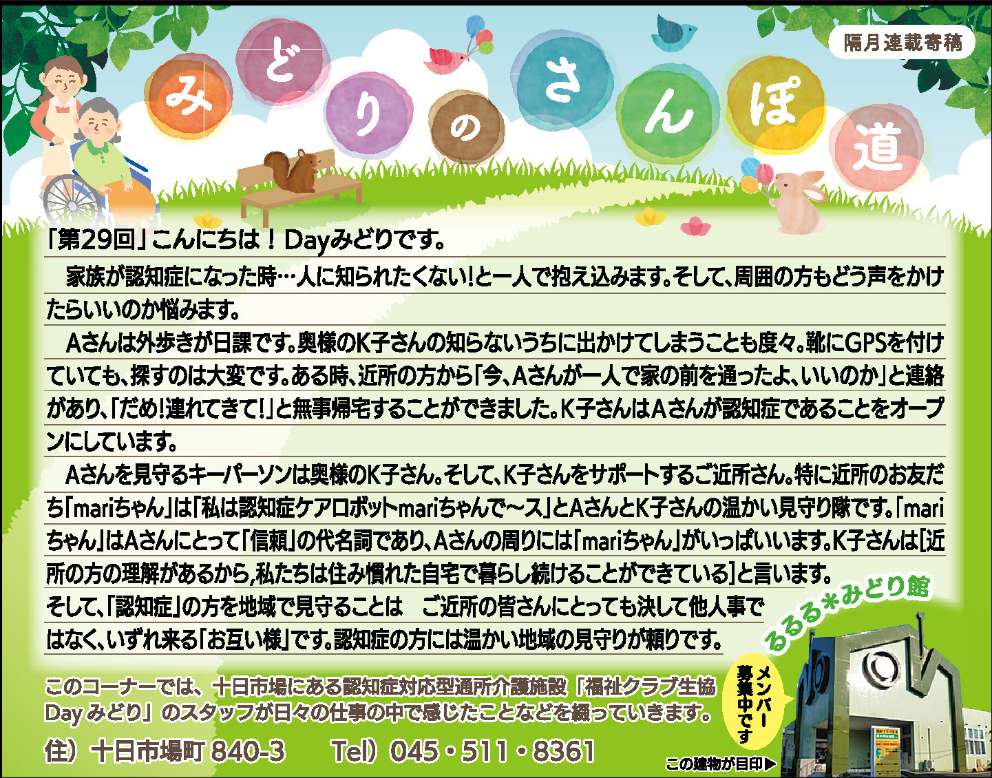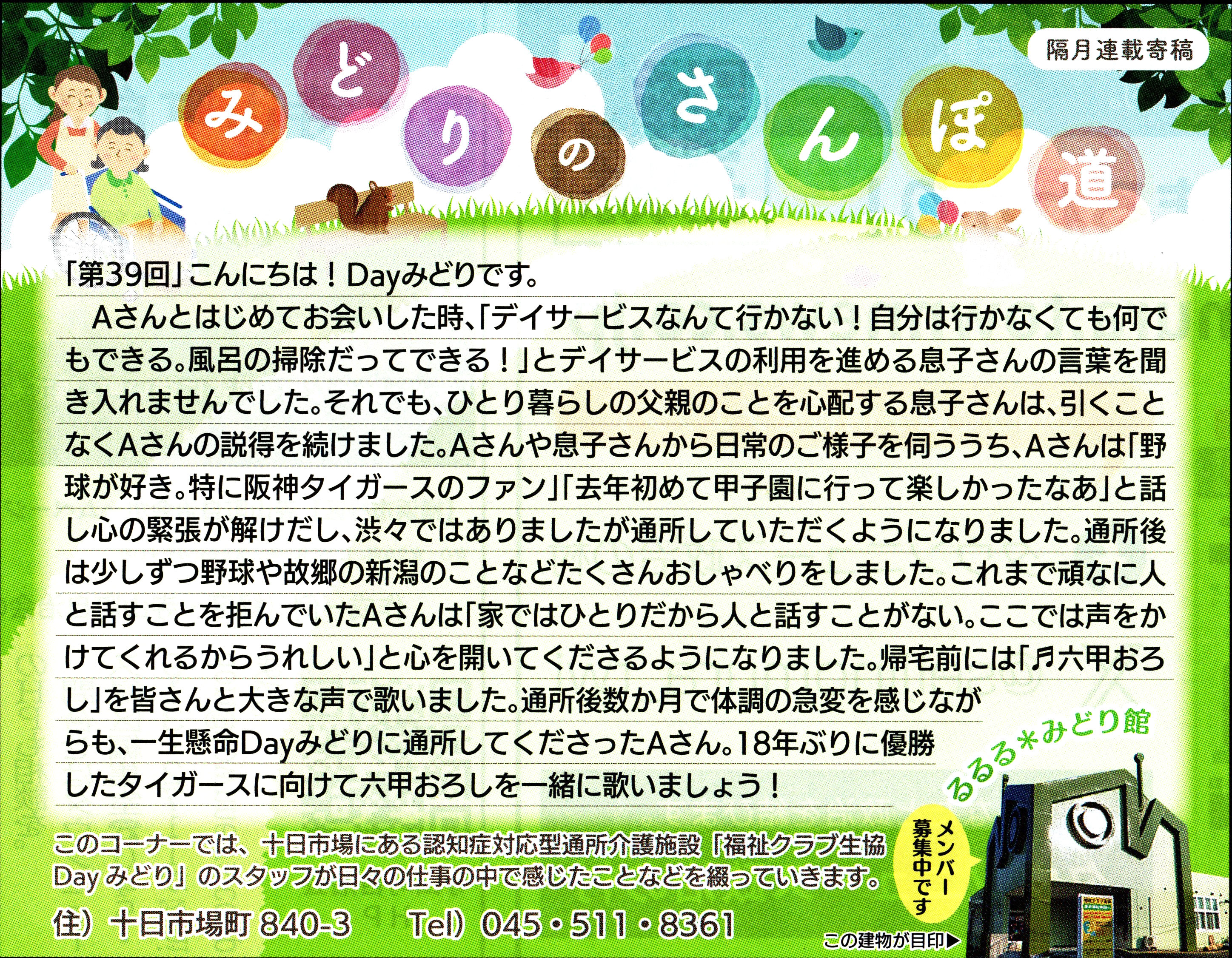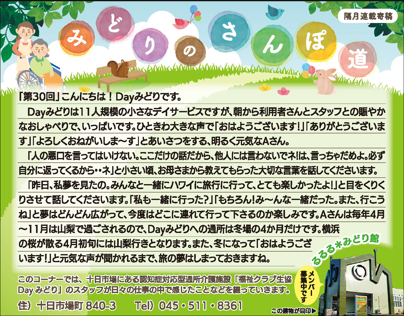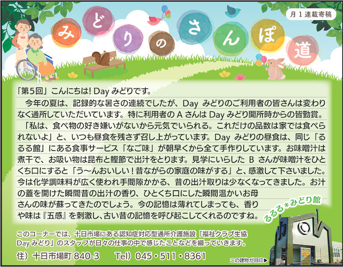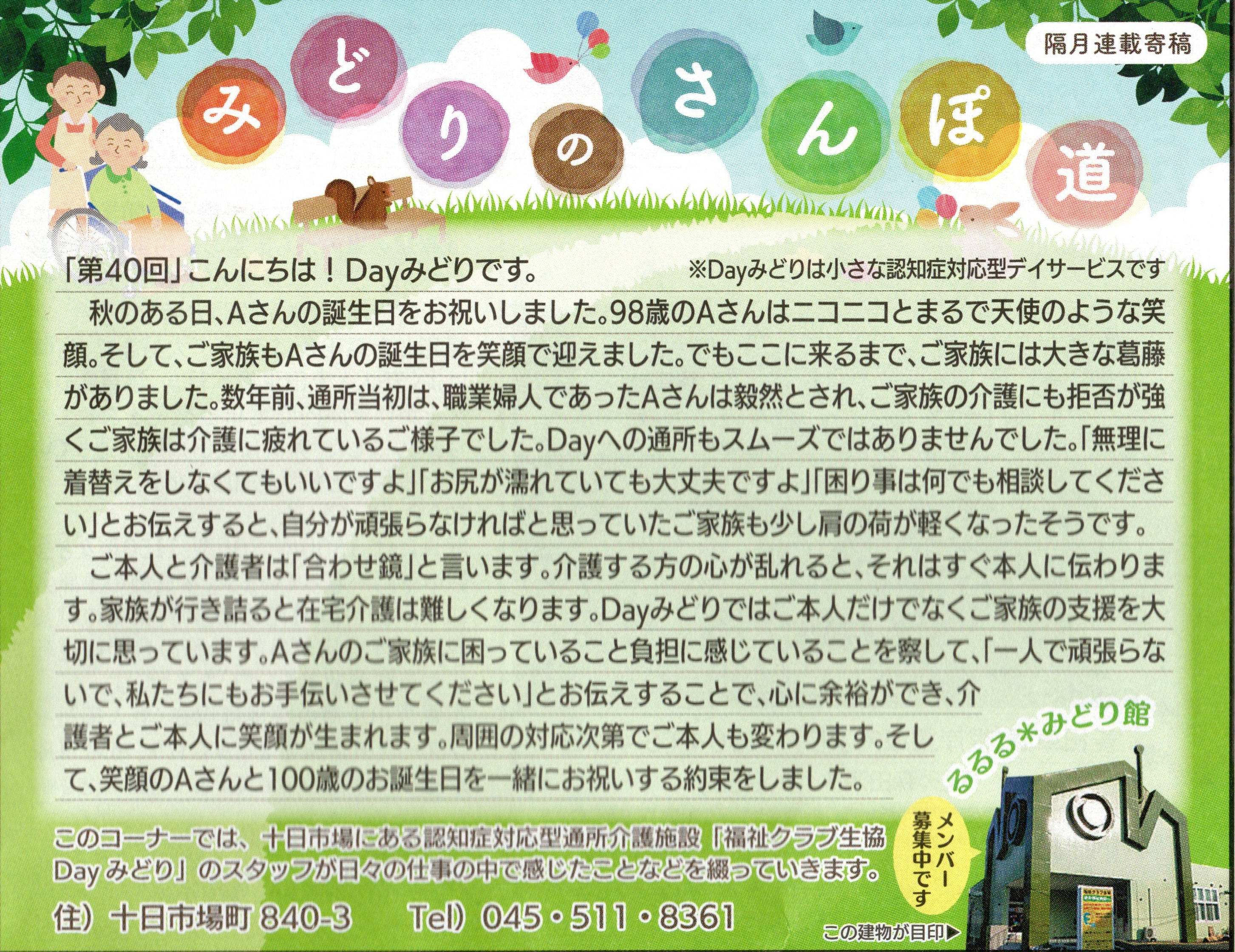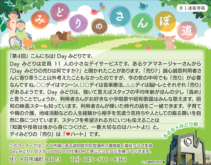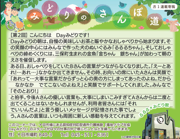 読んでいただいた多くの方から、「毎月楽しみにしている」「もっといろいろな方に見ていただいたら?」とのお言葉をいただき、Dayみどりのホームページでも読んでいただけるようにしています。