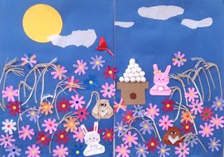 ウサギとタヌキの「月見」。コスモス畑に 紙縒りのススキ 月見団子も美味しそうです。少しずつ、少しずつ作ってきました・・十五夜が待ち遠しい! /9月